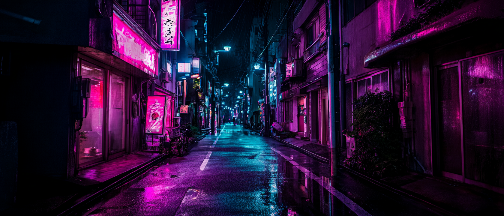 - Cyberpunk + Cinematic → 네온과 대비가 강한 영화적 미래 도시