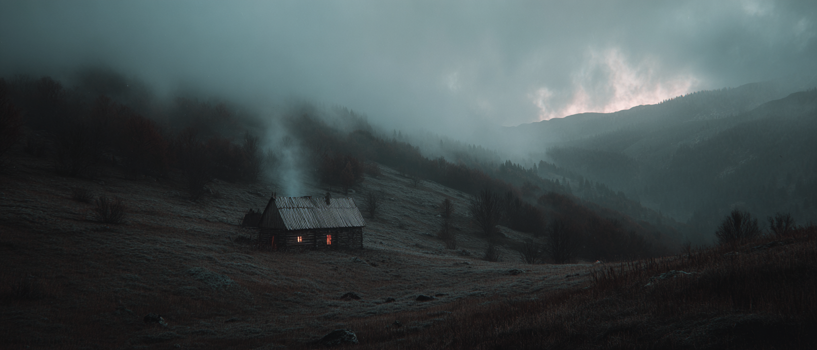 - 개선: a snowy mountain cabin at golden hour with warm window light
